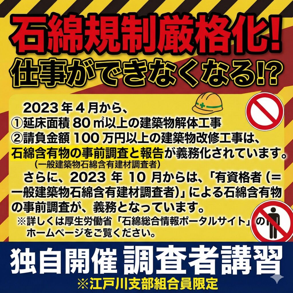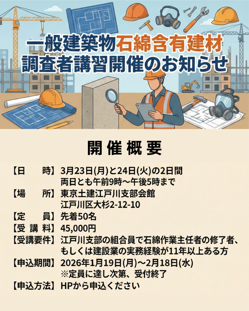 2026年3月23日(月)・24日(火)に江戸川支部独自開催にて一般建築物石綿含有建材調査者講習を実施します!